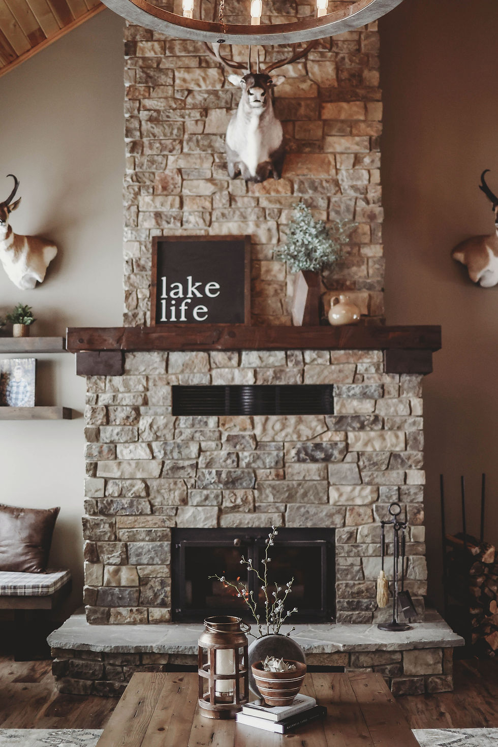 This beautiful cozy rustic home decorated with the Minnesota woods in mind. It features a coffee-brown color pallet, which is complimented by beautiful trophy mounts and natural elements of genuine leather, stone and multiple species of MN wood.